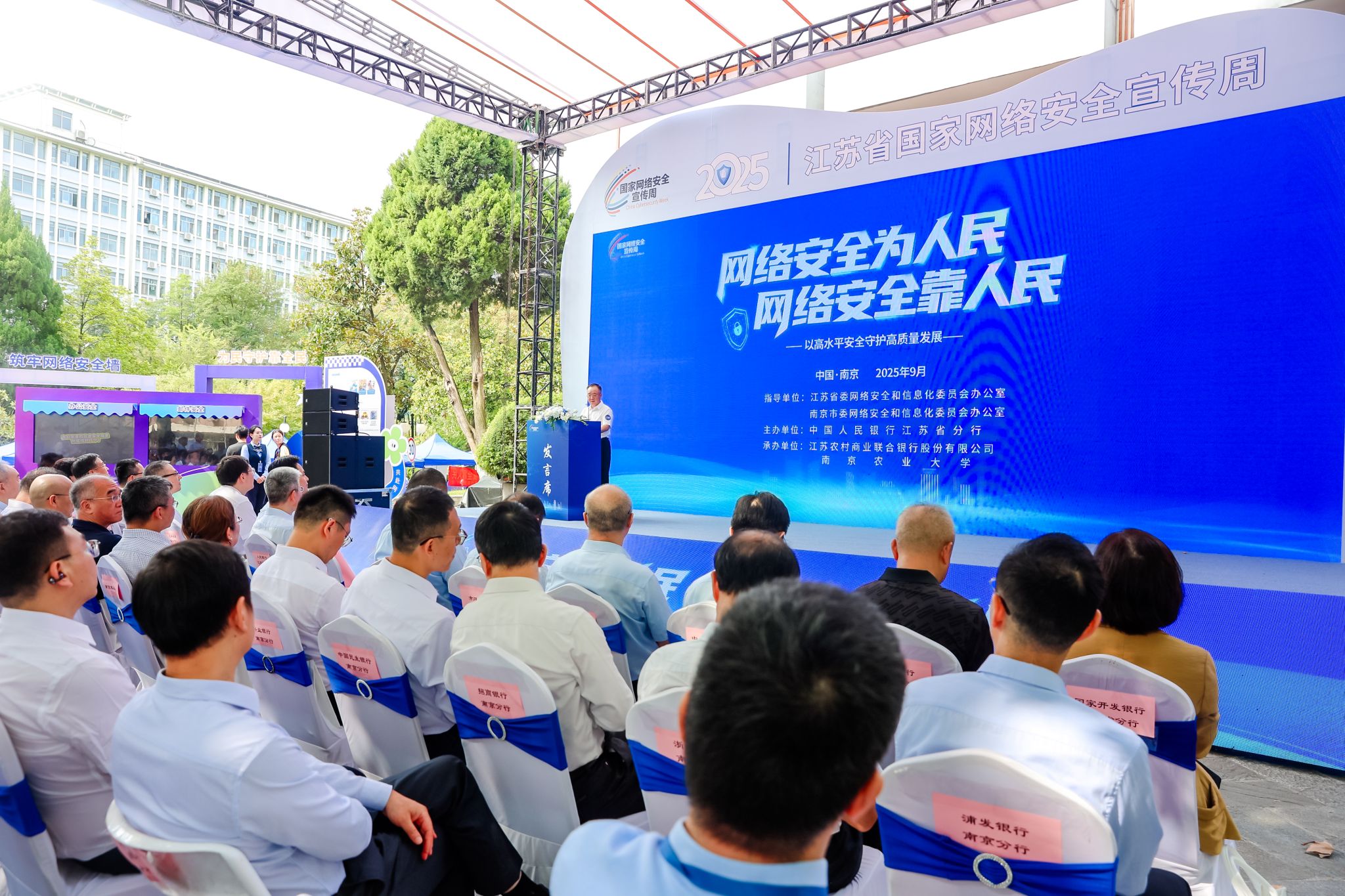 9月19日上午,2025年江苏省国家网络安全宣传周“金融日”活动在我校卫岗校区成功举行。活动由江苏省委、南京市委网信办指导,中国人民银行江苏省分行主办,bwi437官网与江苏农商联合银行联合承办,聚焦“以高水平安全守护高质量发展”主题,通过政校企协同创新模式打造沉浸式金融安全教育课堂,为全省高校师生及公众筑牢网络安全屏障。我校党委常委、副校长单正丰,中国人民银行江苏省分行党委委员、副行长陈涤非,江苏农商联合银行党委委员、首席信息官李健等出席本次活动。