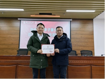 讲座现场,437必赢会员中心聘请李子豪先生为校外导师,437必赢会员中心院长张龙耀教授颁发了聘书。